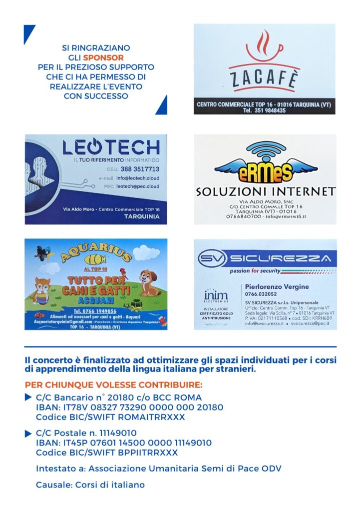 La GENEROSITÀ è stata uno dei tratti distintivi dell’evento: GENEROSITÀ dei coristi dell’“Etruschorus Maria Laura Santi” diretto dal maestro Luca Purchiaroni e del “Roma Vocal Ensemble” diretto dal maestro Federico Incitti e GENEROSITÀ del pubblico che ha dedicato tempo, attenzione ed emozione allo spettacolo e ha lasciato cospicue oFFerte che saranno utilizzate per il progetto dei corsi di italiano per stranieri svolti da un gruppo di volontari dell’Associazione.