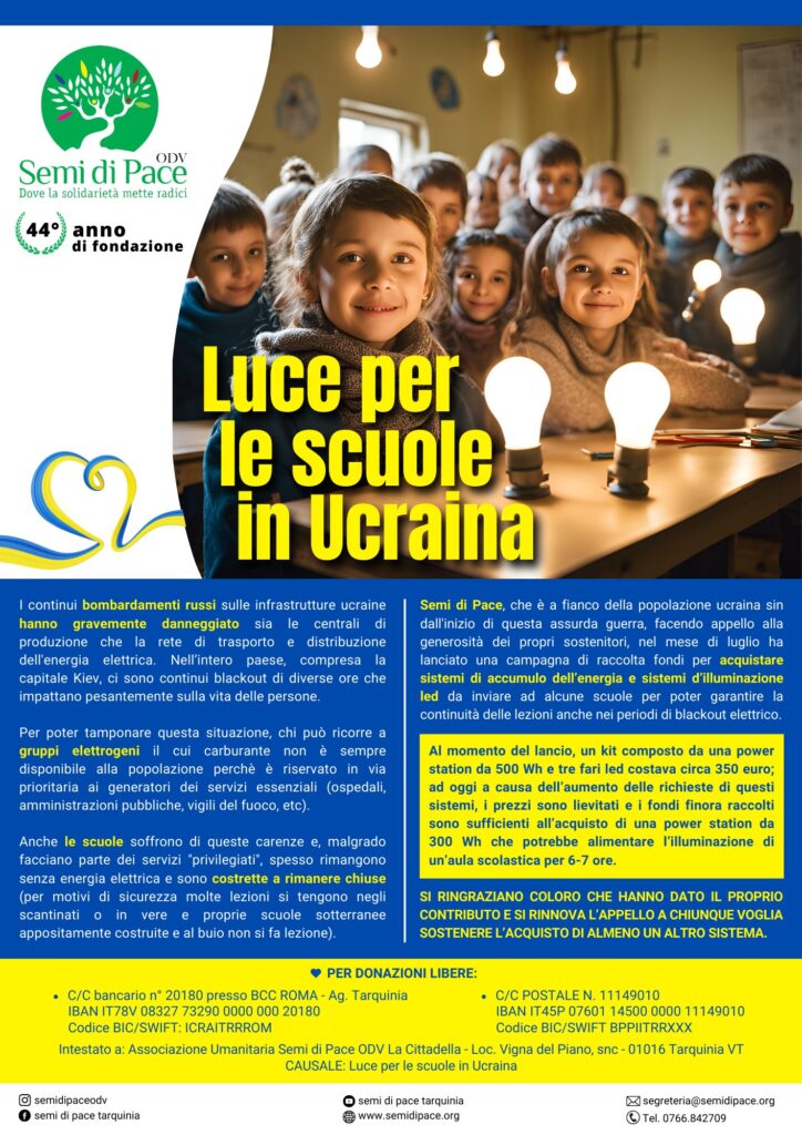 Semi di Pace, che è a fianco della popolazione ucraina sin dall’inizio di questa assurda guerra, facendo appello alla generosità dei propri sostenitori, nel mese di luglio ha lanciato una campagna di raccolta fondi per acquistare sistemi di accumulo dell’energia e sistemi d’illuminazione led da inviare ad alcune scuole per poter garantire la continuità delle lezioni anche nei periodi di blackout elettrico.